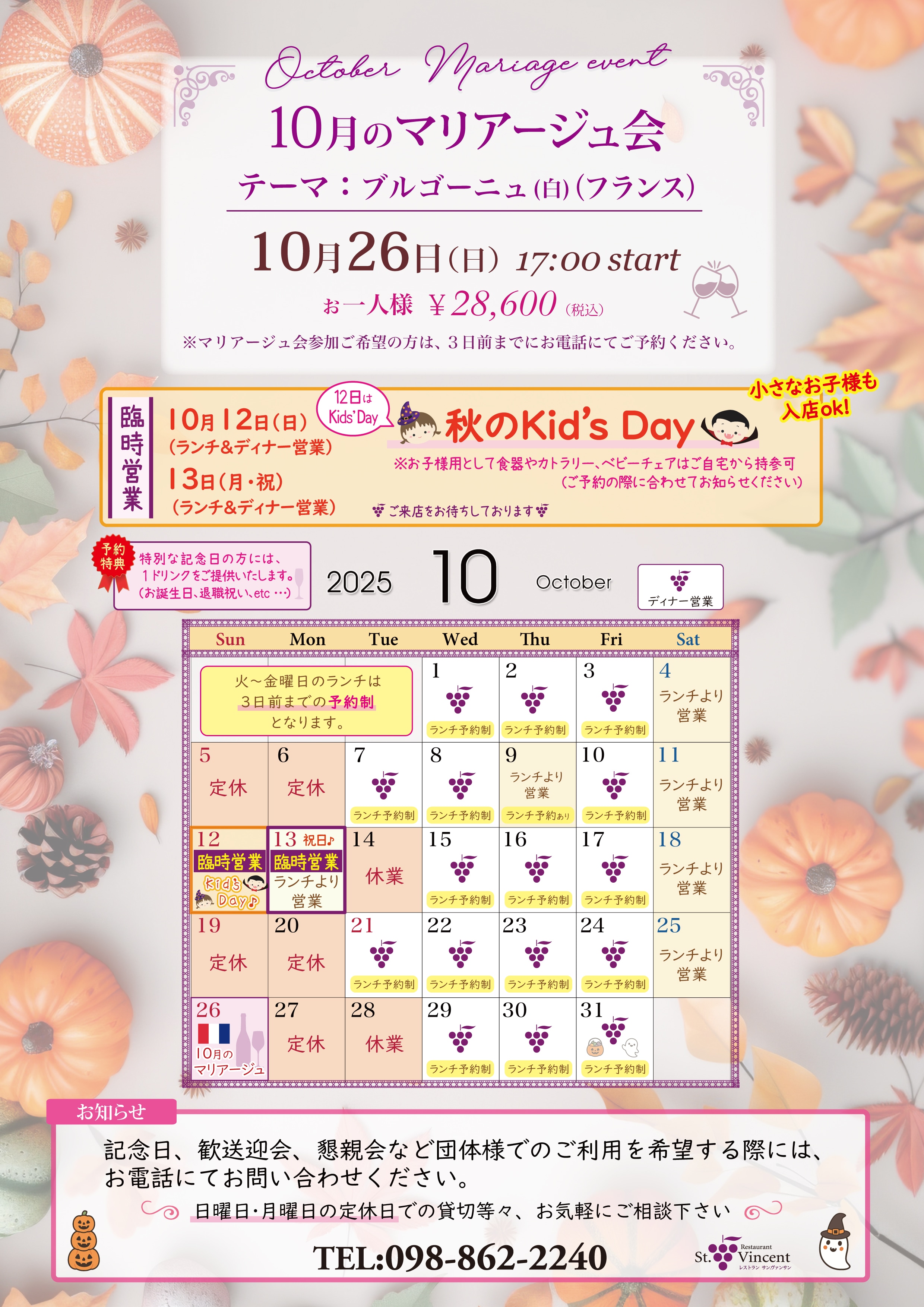 2025年10月のお知らせ~10月9日(木):ランチより営業、12日(日):臨時営業<ランチより営業&Kid's Day> 、13日(月・祝日):臨時営業<ランチより営業>、10月のマリアージュ会・10月26日(日)<テーマ:ブルゴーニュ(白)(フランス)>
