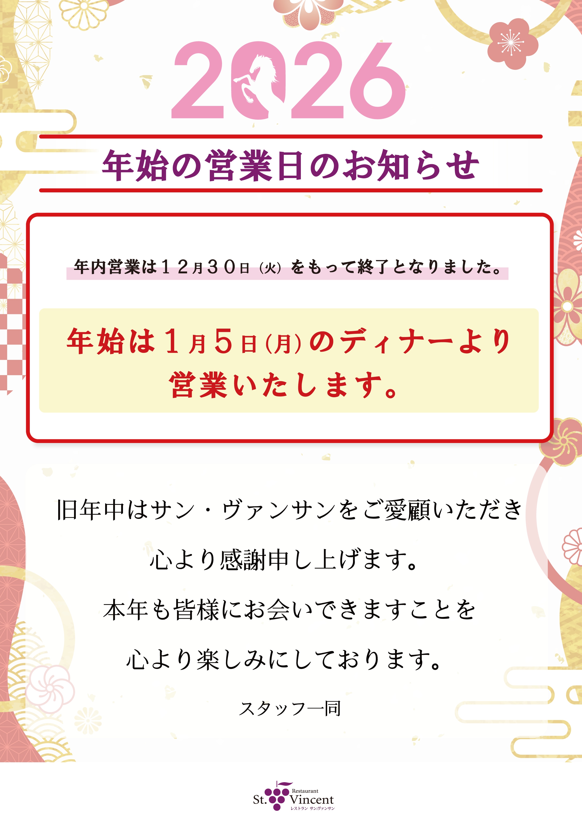 新着情報|2026年 年始営業のご案内 ~年始営業は1月5日(ディナー)から
